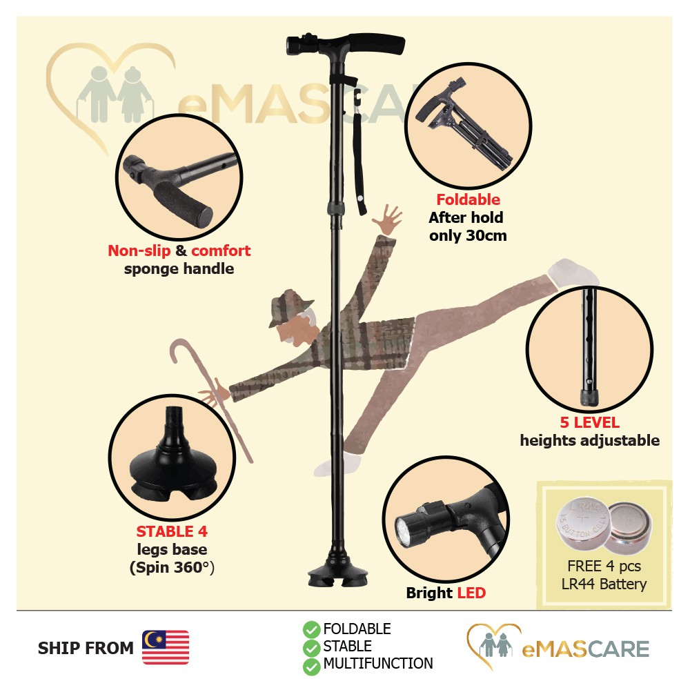 Walking Stick Foldable Adjust Height Tongkat Cane Pivot LED Trusty